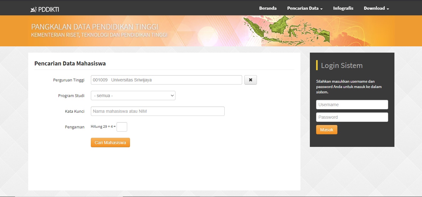 Pastikan apakah data saudara sudah benar, apabila ada kekliruan data yang ditampilkan saudara dapat melapor ke admin program studi/jurusan dengan membawa kelengkapan data pendukung atau mengisi pada link form pemutakhiran data di (https://pemutakhirandata.unsri.ac.id/).