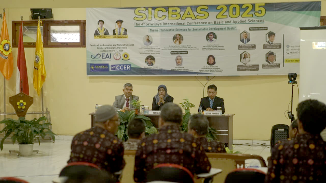 Palembang, 6 November 2025 — Universitas Sriwijaya melalui Fakultas Matematika dan Ilmu Pengetahuan Alam (FMIPA) kembali menunjukkan komitmennya dalam pengembangan ilmu pengetahuan dengan sukses menyelenggarakan The 4th Sriwijaya International Conference on Basic and Applied Sciences (SICBAS 2025). Konferensi internasional dua tahunan ini mengangkat tema “Innovative Sciences for Sustainable Development Goals” dan dilaksanakan secara hybrid, menggabungkan partisipasi daring dan luring dari berbagai negara.