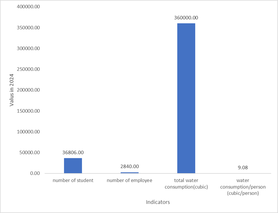 Selain memiliki area yang luas, UNSRI juga memiliki jumlah mahasiswa yang besar. Pada tahun 2024, UNSRI memiliki 36.806 mahasiswa dan 2840 pegawai, sehingga total populasi kampus adalah 39.646 orang. Dengan jumlah yang besar ini, UNSRI telah menggunakan total air sebanyak 360.000 m3, sehingga total konsumsi air per orang selama tahun 2024 adalah 9,08 m3 per orang.
